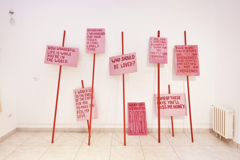 У истраживању се такође ослања на дело „Фрагменти љубавног говора“ Ролана Бартa. Бартово истраживање љубавног дискурса и унутрашњег монолога заљубљеног субјекта посебно инспирише, истичући искрену тежњу за повезаношћу и интимношћу, где се љубавни говор истовремено преплиће са самоћом и oдсуством. Ова изложба не представља само савремени концепт љубави, већ је и пут у простор емоција и наратива које заљубљени субјект константно ствара. Изложба настоји да нагласи важност љубавног дискурса, који не сме бити на маргинама, јер он данас обухвата и продире у све аспекте живота појединаца, како на индивидуалном тако и на друштвеном плану.